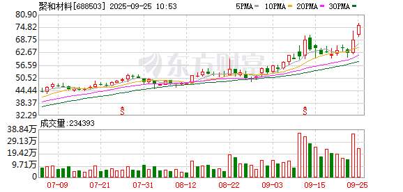 聚和材料股价创出历史新高,截至9:42,该股上涨7.45%,股价报73.83元,成交量1043.69万股,成交金额7.57亿元,换手率5.78%,该股最新A股总市值达178.69亿元,该股A股流通市值133.38亿元。